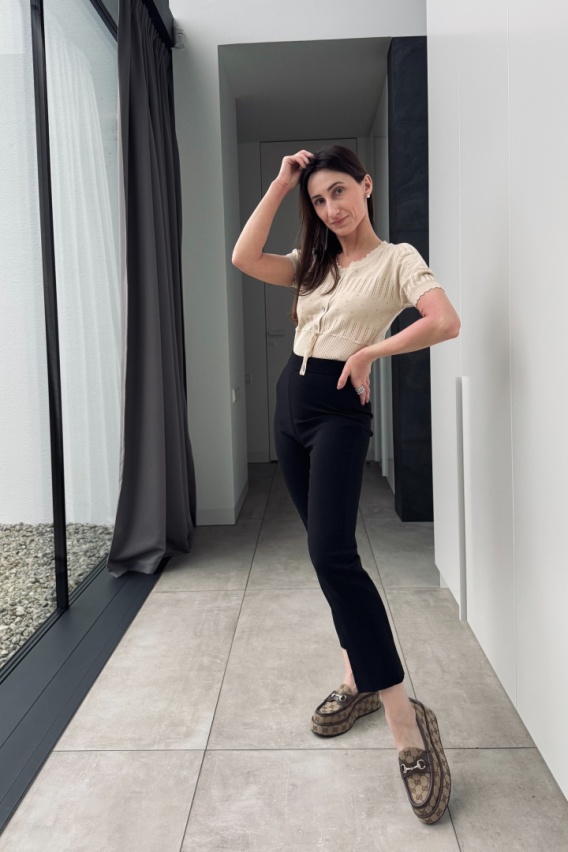 Ania ma 161 cm wzrostu i na co dzień nosi rozmiar XS/S (wymiary: biust 82 cm, talia 72 cm, biodra 92/93 cm).