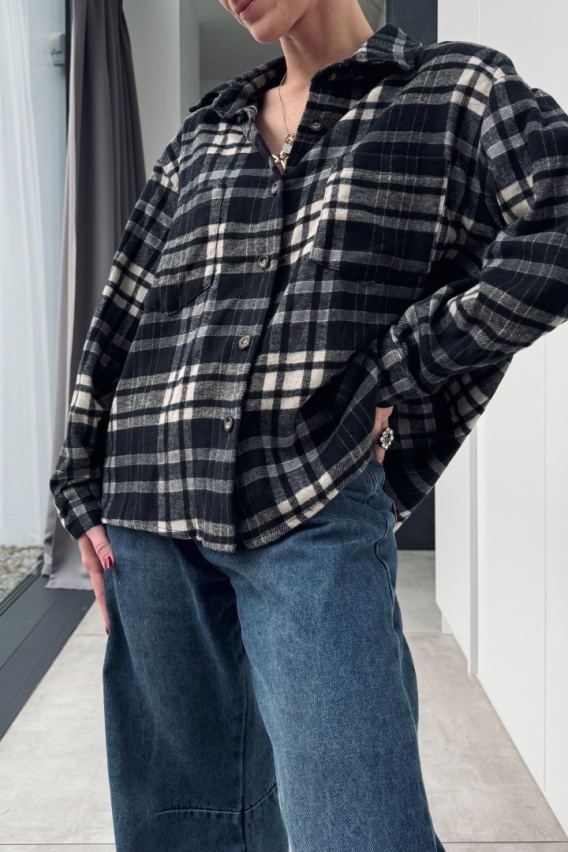 Czarno – beżowa krata to absolutny must have sezonu – uniwersalna, ponadczasowa i pasująca do wszystkiego: od jeansów po skórzane spodnie, czy legginsy. Dwie praktyczne kieszenie z przodu dodają jej casualowego charakteru, a lekko oversize’owy krój zapewnia swobodę i niewymuszoną elegancję.
