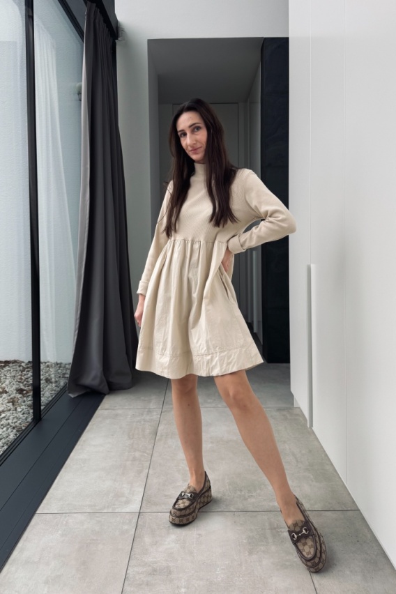 Ta urocza sukienka w eleganckim beżowym kolorze od włoskiej marki Wiya to idealne połączenie prostoty i stylu. Dzięki połączeniu dwóch struktur materiału – prążkowanej góry i gładkiego, sztywnego dołu z bawełny – sukienka prezentuje się nowocześnie i efektownie. Prążkowana góra z półgolfem subtelnie podkreśla szyję, dodając stylizacji nuty elegancji.