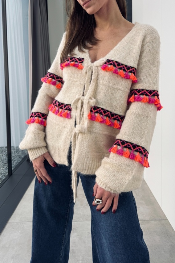 Ten wyjątkowy, beżowy sweter to absolutny must have dla każdej miłośniczki mody, która ceni wygodę i oryginalny styl. Miękka, przyjemna w dotyku dzianina otuli Cię w chłodniejsze dni, a kolorowe frędzle w odcieniach neonowego różu i pomarańczu dodadzą energii i charakteru każdej stylizacji.