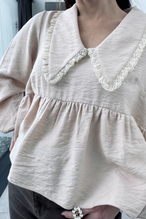 Wykonana z delikatnej, lekko marszczonej wiskozy w odcieniu beżu to kwintesencja elegancji w lekkim, nowoczesnym wydaniu. Luźny fason z odcięciem pod biustem nadaje lekkości i swobody, a szeroki kołnierz ozdobiony koronkową, jaśniejszą lamówką to detal, który sprawia, że całość wygląda absolutnie unikatowo i stylowo.