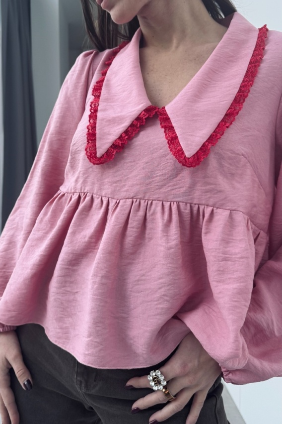Wykonana z delikatnej, lekko marszczonej wiskozy w odcieniu pudrowego różu, przyciąga uwagę nie tylko kolorem, ale też krojem. Luźny fason z odcięciem pod biustem nadaje lekkości i swobody, a szeroki kołnierz ozdobiony koronkową, czerwoną lamówką to detal, który sprawia, że całość wygląda absolutnie unikatowo i stylowo.