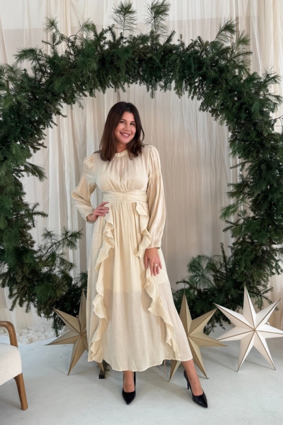 Postaw na ponadczasową kobiecość i subtelny luksus. Poczuj się jak bogini w tej niezwykłej, brokatowej sukience od włoskiej marki Lavysh. Ta wyjątkowa sukienka maxi w odcieniu beżowym łączy w sobie delikatność, lekkość i nowoczesną elegancję oraz zachwyca każdym, dopracowanym szczegółem. Pięknie układa się na sylwetce, a marszczenia i zwiewne falbany nadają jej romantycznego charakteru. Wysoki stan z podkreśleniem talii wysmukla figurę, a falbany nadają sukience wyjątkowej dynamiki przy każdym ruchu.