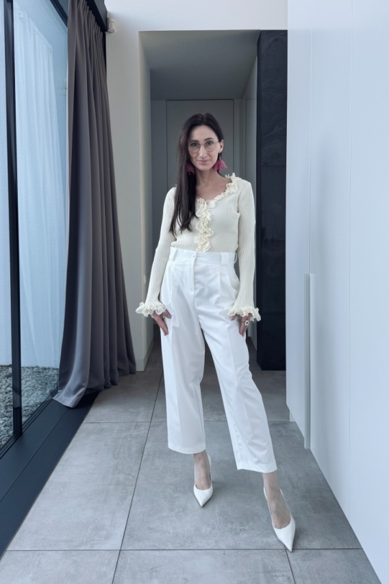 Spodnie mają wysoki stan z szerokim pasem, który trzyma brzuch i podkreśla wcięcie w talii. Delikatne zakładki z przodu dodają im lekkości i sprawiają, że materiał miękko opływa sylwetkę, nie opinając nadmiernie. Nogawka jest prosta, lekko zwężana, o długości odsłaniającej kostkę - idealna do obcasów, ale też do płaskich butów. Gładka, lekko śliska, śnieżnobiała tkanina prezentuje się bardzo szlachetnie i jest na tyle uniwersalna, że świetnie odnajdzie się zarówno w total looku, jak i z kontrastową górą.