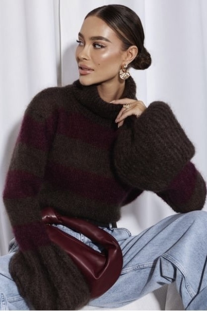 Ten wyjątkowy sweter z golfem, w szerokie paski to absolutny must have dla każdej miłośniczki mody, która ceni jakość, wygodę i oryginalny styl. Miękki, przyjemny w dotyku - otuli Cię w chłodniejsze dni. Zjawiskowy rękaw typu dzwonek doda charakteru Twojej stylizacji, a świetny skład sprawi, że poczujesz się w nim luksusowo i niezwykle wyjątkowo.