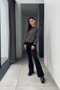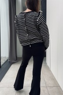 Ten kardigan to absolutny must - have w Twojej szafie! Romantyczne falbanki na ramionach i materiałowe guziki z tyłu dodają mu wyjątkowego uroku i oryginalności. Ponadczasowe czarno - białe paski oraz faliste wykończenie dołu i rękawów sprawiają, że jest to niezwykle urokliwy i stylowy model. Możesz nosić go również tyłem na przód, tworząc dwie różne stylizacje. Kardigan włoskiej marki Y&Two Woman. W zestawie zapasowy guzik.