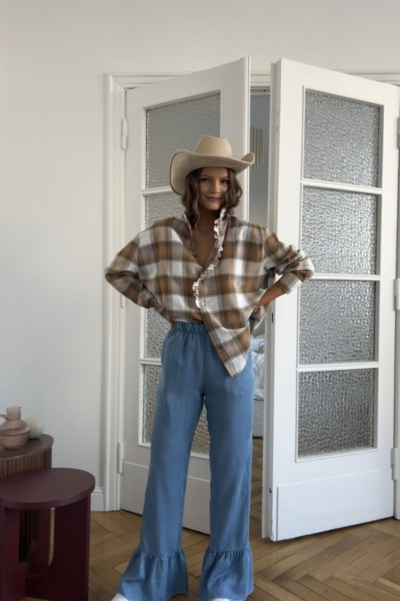 Uszyte z miękkiej, lejącej tkaniny w odcieniu jasnego denimu, subtelnie opływają sylwetkę, nie opinając ud ani bioder. Wysoki stan z elastyczną gumą w pasie dopasowuje się do talii i pięknie ją podkreśla, jednocześnie maskując okolice brzucha. Szeroka nogawka zakończona falbaną dodaje lekkości i ruchu przy każdym kroku, tworząc efekt nowoczesnego, dziewczęcego boho. Idealne na co dzień, na city break, na wakacje czy długie, letnie wieczory.