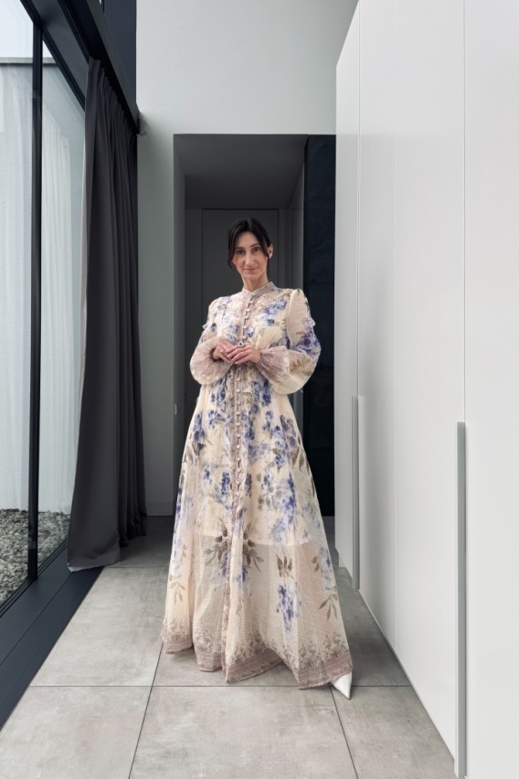 Długa, dopasowana na górze, rozszerzana ku dołowi, pięknie wydłuża sylwetkę. Delikatny, półtransparentny materiał układa się lekko na ciele, a talię podkreśla cienki pasek. Stójka i rząd guzików wzdłuż całej długości dodają jej szlachetnego charakteru, a luźne, bufiaste rękawy zakończone gumkami nadają całości romantycznego luzu. Pastelowy, kwiatowy nadruk w odcieniach beżu, lila i błękitu uzupełniają trójwymiarowe aplikacje płatków kwiatów, które pięknie poruszają się podczas chodzenia.