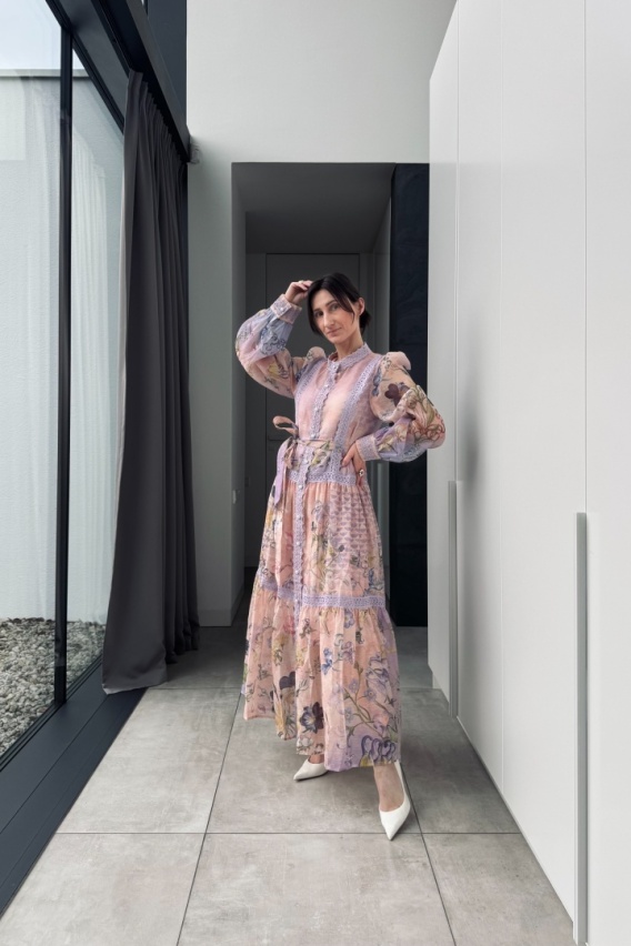Długa, lekko rozkloszowana sukienka o miękko układającym się kroju subtelnie wysmukla talię dzięki wiązaniu w pasie. Pastelowy, kwiatowy print łączy odcienie różu i lila, tworząc efekt akwareli, a transparentne, bufiaste rękawy dodają lekkości i ruchu. Całość zdobią misternie wykończone koronkowe wstawki w kolorze lawendy oraz rząd dekoracyjnych guzików z perłowym wykończeniem, które nadają projektowi biżuteryjnego charakteru. Sukienka idealna na wesela, chrzciny, rodzinne uroczystości, a także eleganckie garden party czy wieczorne wyjścia, gdy chcesz wyglądać bardzo kobieco, ale wciąż naturalnie.