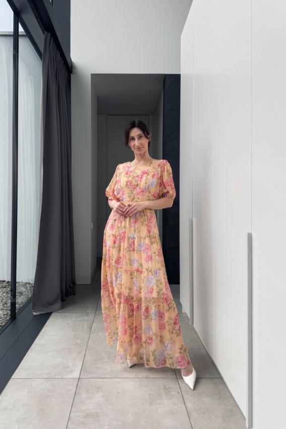 Długa, romantyczna sukienka o luźnym, lejący kroju, uszyta z miękkiej, półtransparentnej tkaniny na jasnej podszewce. Góra subtelnie marszczona, z okrągłym dekoltem i krótkim bufkowym rękawem, który miękko opina ramię, nie krępując ruchów. Talia delikatnie podkreślona – bez sztywnego zaznaczania, ale z efektem wysmuklenia. Rozkloszowany dół z lekkimi przeszyciami tworzy miękkie fale, które nadają sukience lekkości i klasy. Print w kwiaty w odcieniach różu i lila na morelowym tle dodaje całości świeżości i bardzo kobiecego charakteru. Doskonała na wiosenno - letnie przyjęcia, komunie, wesela, ale też na popołudniowe spotkania, gdy chcesz wyglądać elegancko, a jednocześnie czuć się swobodnie.