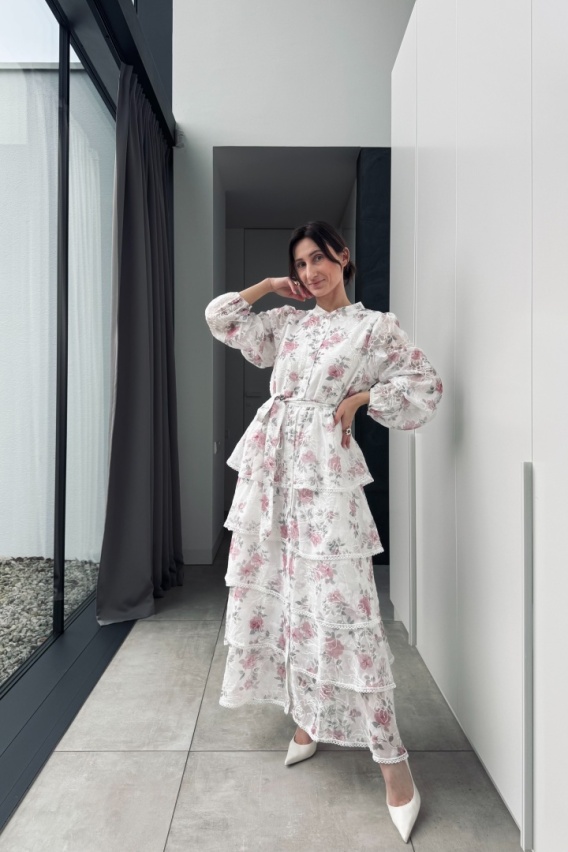 Krój jest prosty w linii, z dopasowaniem w talii dzięki materiałowemu paskowi, który pozwala podkreślić figurę dokładnie tak, jak lubisz. Długie, lekko bufiaste rękawy zakończone gumką dodają sukience miękkości i nowoczesnego, kobiecego charakteru. Góra zapinana na drobne guziki z okrągłym kołnierzykiem nadaje całości szlachetną skromność, a wielopoziomowe falbany na dole pięknie pracują w ruchu. Kwiatowy print w odcieniach pudrowego różu i delikatnej zieleni na jasnym tle sprawia, że to idealna propozycja na uroczystości, letnie przyjęcia, rodzinne spotkania czy ważne wyjścia, kiedy chcesz wyglądać subtelnie, ale bardzo efektownie.