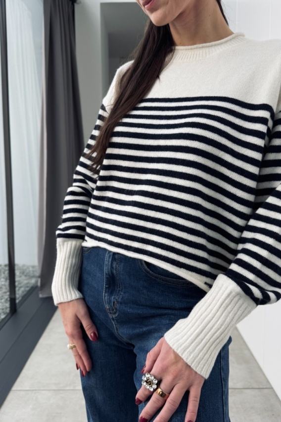 Klasyka w nowoczesnym wydaniu – sweterek w granatowe, ponadczasowe paski od razu przyciąga wzrok. Tył gładki, przód nieco krótszy, a rękawy zakończone długimi ściągaczami dodają mu lekkości i charakteru. Mięsisty i wygodny model włoskiej marki Y&Two Woman – idealny do codziennych, stylowych zestawów.