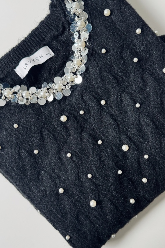 Elegancja i styl w jednym! Ten czarny sweterek to połączenie klasy i ponadczasowego szyku. Ozdobiony subtelnymi perełkami oraz dekoracyjnym kołnierzem z błyszczącymi detalami, doda Twojej stylizacji wyjątkowego uroku. Wykonany z miękkiej, przyjemnej w dotyku dzianiny, gwarantuje komfort noszenia przez cały dzień.