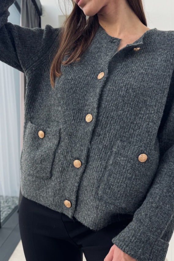 Szary, melanżowy kardigan w prążki to klasyk, który od razu otula miękkością i daje poczucie pełnego komfortu. Złote guziki dodają mu elegancji i subtelnego blasku, dzięki czemu doskonale wpisuje się zarówno w codzienne, jak i bardziej wyrafinowane stylizacje. Praktyczne kieszonki na przodzie sprawiają, że jest nie tylko stylowy, ale i funkcjonalny. Włoski model Y&Two Woman – ponadczasowy must have na jesień i zimę.