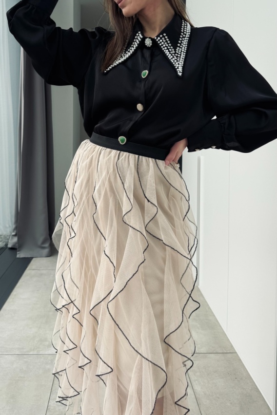 Spódnica składa się z dwóch warstw: krótszej, gładkiej podszewki z miękkiej wiskozy oraz tiulowej warstwy wierzchniej, składającej się z półokrągłych kawałków tiulu, starannie obszytych czarną lamówką. Ten kontrastowy akcent dodaje spódnicy charakteru i sprawia, że całość prezentuje się niezwykle stylowo. Czarna gumka w pasie gwarantuje wygodne dopasowanie, a jednocześnie wprowadza nowoczesny akcent.