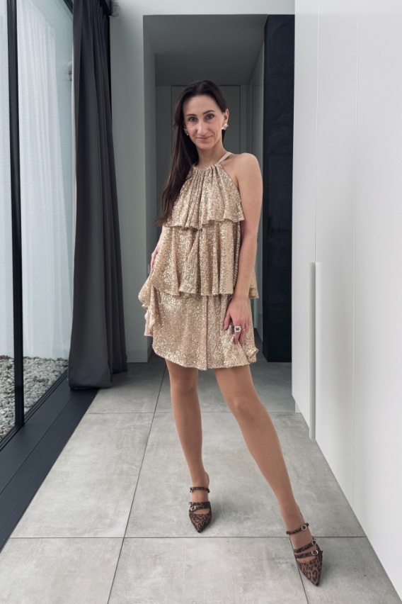 Zwiewna sukienka z cekinami, z kokardą z tyłu | złota